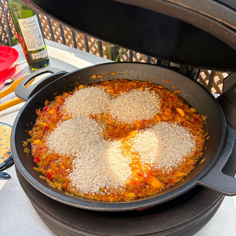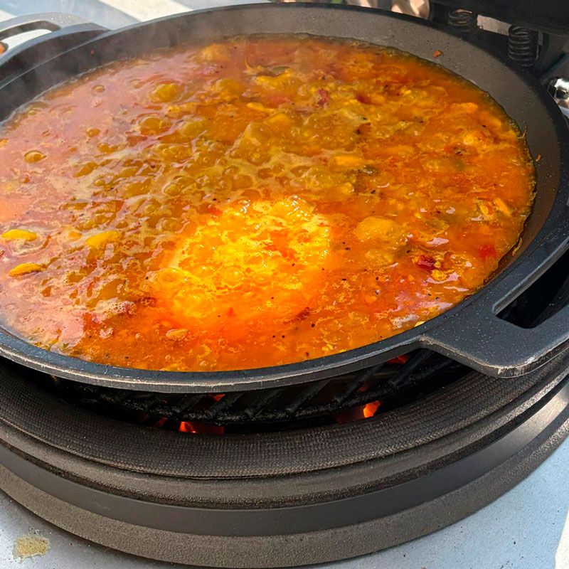 Vierte el caldo de pescado bien caliente. Reparte el arroz uniformemente y añade el azafrán. Cierra la tapa de tu The Bastard. Al cerrar la tapa, creas un flujo de aire circular que cocina el arroz de forma homogénea, como si fuera un horno de convección profesional pero con el alma del carbón.