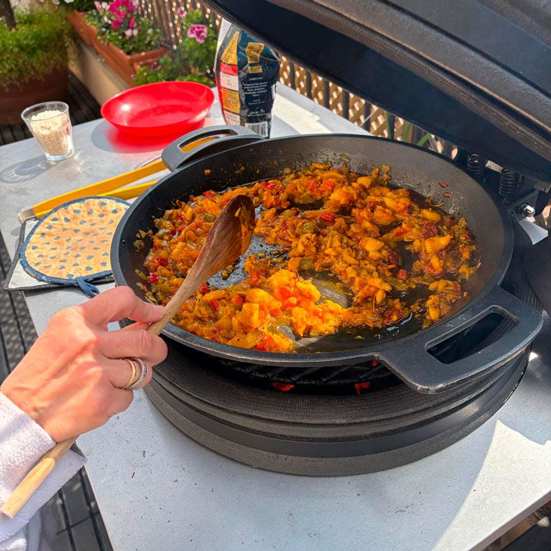 Si buscas un socarrat perfecto, abre ligeramente las ventilaciones inferiores en el último minuto para subir la temperatura rápidamente.